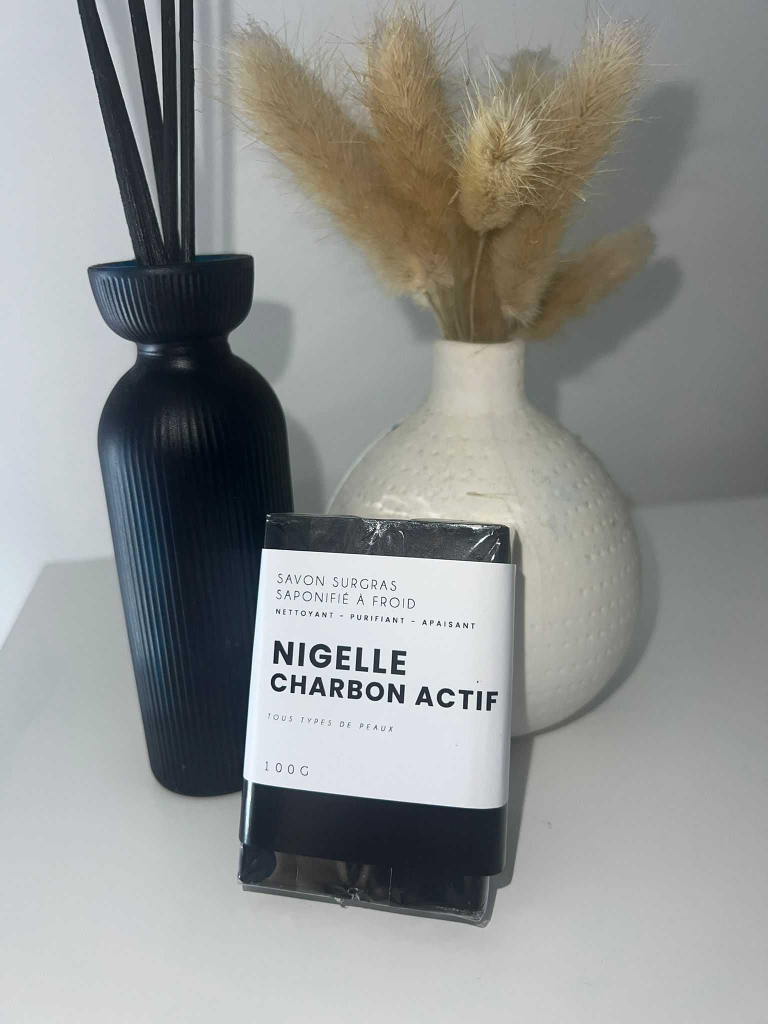 Découvrez notre savon artisanal à la nigelle et au charbon actif, une alliance puissante pour une peau purifiée et éclatante. La nigelle apaise et régénère, tandis que le charbon actif aide à éliminer les impuretés et les toxines, laissant votre peau propre et revitalisée. Offrez à votre peau le meilleur de la nature avec notre savon artisanal à la nigelle et au charbon actif.